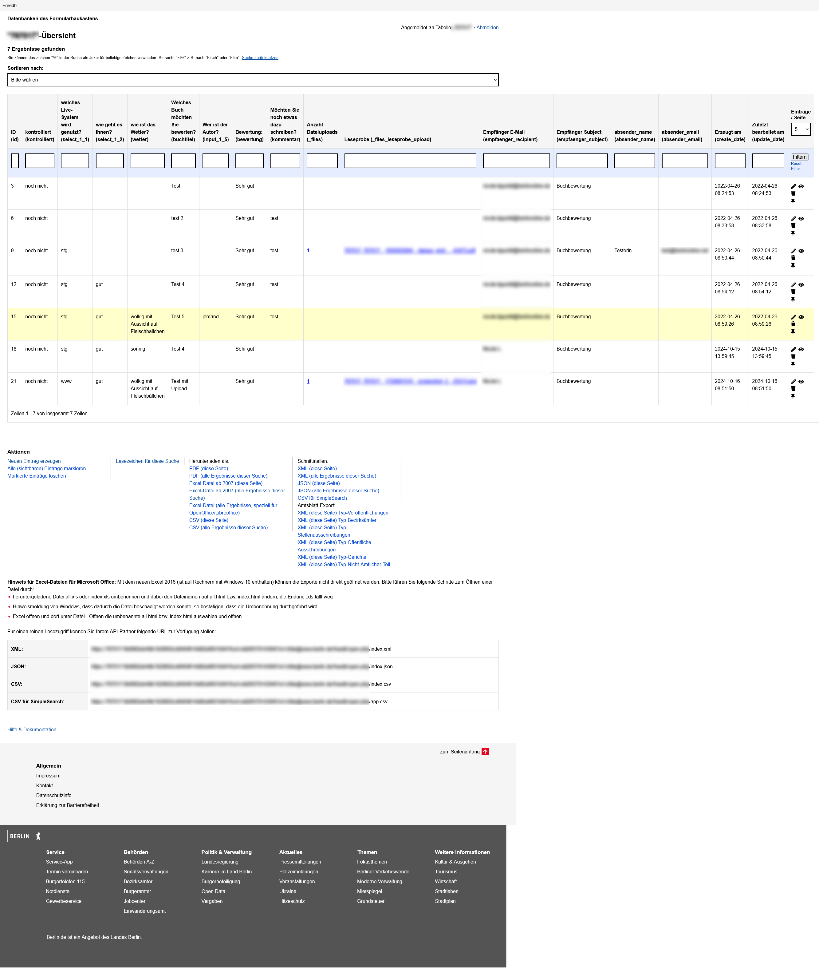Nach der Anmeldung sehen Sie alle Datenbankeinträge, die von den Nutzer*innen über das Formular gesendet wurden, sortiert in unterschiedliche Spalten. Die Namen der Spalten sind mit den Titeln der Formularfelder identisch. In den Klammern befinden sich die IDs der Felder, die automatisch generiert werden, wenn keine explizit vergeben wurden.